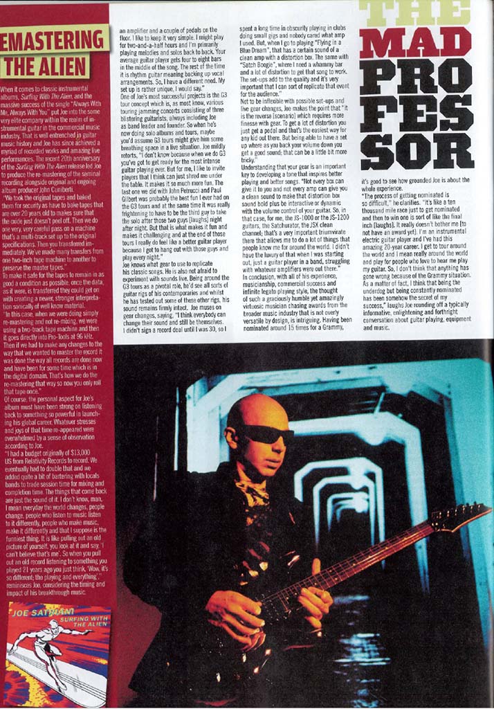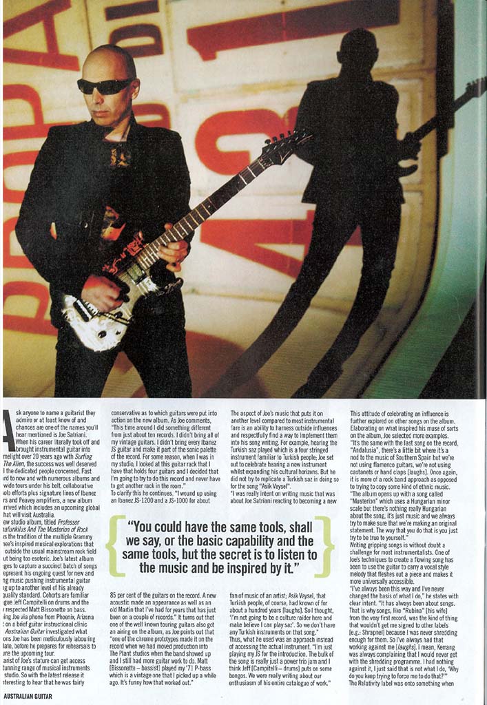 The new studio album, titled ‘Professor Satchifunkilus and the Musterion of Rock’ follows the tradition of the multiple Grammy nominee’s inspired musical explorations that reach outside the usual mainstream rock field without being too esoteric. Joe’s latest album manages to capture a succinct batch of songs that represent his ongoing quest for new and exciting music pushing instrumental guitar playing up to another level of his already high quality standard. Cohorts are familiar colleague Jeff Campitelli on drums and the highly respected Matt Bissonette on bass. Catching Joe via phone from Phoenix, Arizona whilst on a brief guitar instructional clinic jaunt, Australian Guitar’s Paul Southwell investigated what creations Joe has been meticulously labouring on before he prepares for rehearsals to fine tune the upcoming tour.