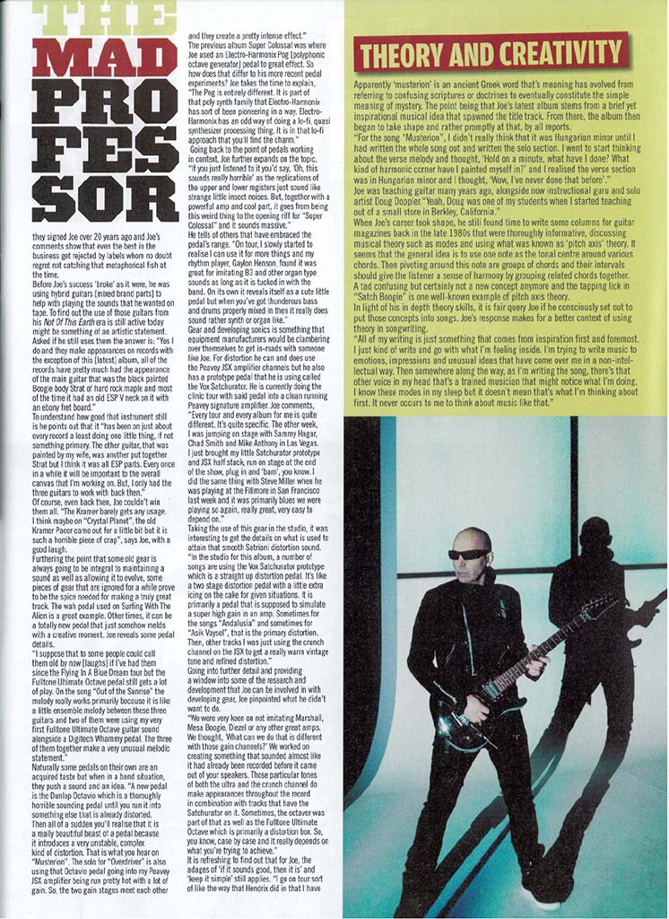Joe was teaching guitar many years ago, alongside now instructional guru and solo artist Doug Doppler as confirmed by Joe, “Yeah, Doug was one of my students when I started teaching out of a small store in Berkley, California.” When Joe’s career took shape, he still found time to write some columns for guitar magazines back in the late 1980s that were thoroughly informative, discussing musical theory such as modes and using what was known as ‘pitch axis’ theory. It seems that the general idea is to use one note as the tonal centre around various chords. Then pivoting around this note are groups of chords and their intervals should give the listener a sense of harmony by grouping related chords together. A tad confusing but certainly not a new concept anymore and the tapping lick in ‘Satch Boogie’ is one well known example of pitch axis theory.