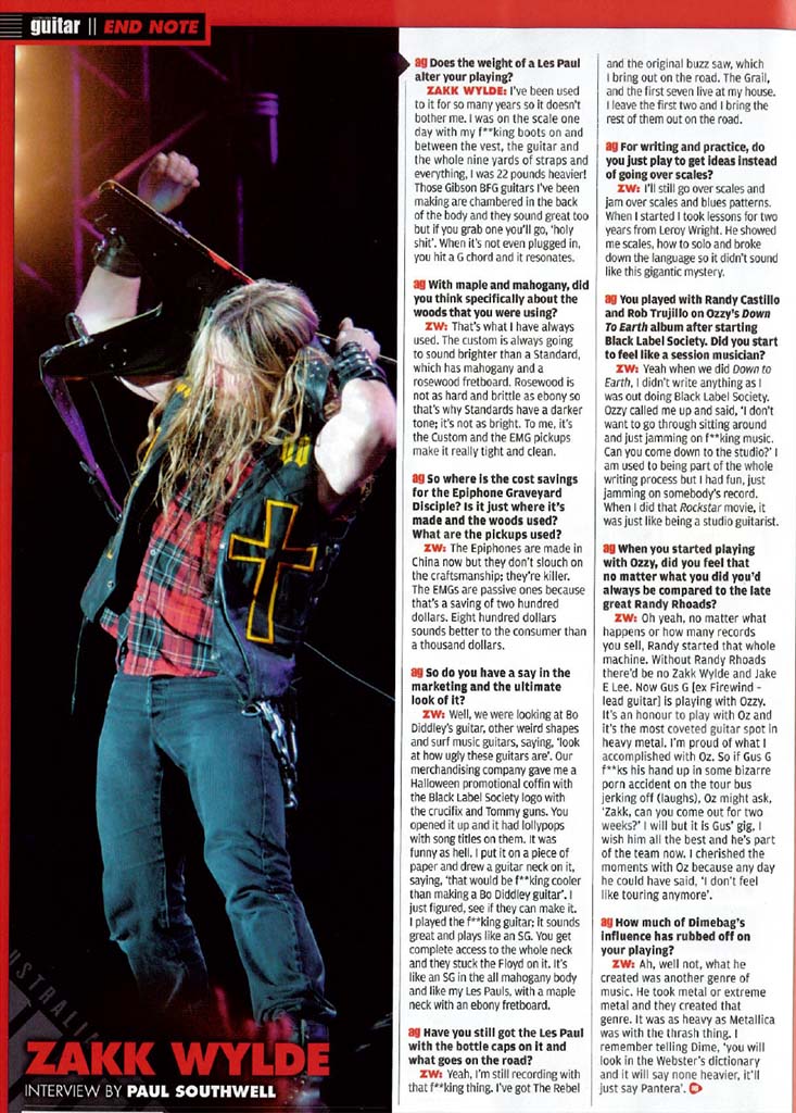 ZW: Um, well no, the way I got that GD, we were looking at Bo Diddley’s guitar and as ugly as that is, me and my buddies were talking about it, remember the late to mid sixties Vox – the phantom or the tear drop, you know, Brian Jones, they were really fucking weird shapes and the surf music guitars and we were just looking at them saying, ‘God, look at how butt ugly these fucking guitars are’ and we were taking a lot and going ‘oh’ and just buying the ugliest fucking guitars we could possibly find. Me and my buddies were taking a look at it and shit on ebay so ah, one of my buds was like, ‘why don’t you have them make you one of those Bo Diddley fucking guitars’ and you know how Billy Gibbons has that fucking Billybones guitar now which is godawfully ugly, man. It’s so fucking ugly that it almost looks cool. What happened is our merch company gave me a promotional item probably the size of this tape recorder and it was the shape of a coffin with the BLS with the crucifix in it and the tommy guns in it and the logo, it was a Halloween promotional item. You opened up the coffin and it had lollypops in it but it had all of the song titles like, ‘House of Doom’, ‘Graveyard Disciples’,  ‘Death March’, ‘Genocide Junkies’ on the lollypops. It was fucking funny as hell. I had that and I just said, like if you and me were sitting there and I just put it on a piece of paper and I drew a guitar neck on it and you and me were looking at it, saying, dude, that would be fucking cool man, instead of making a Bo Diddley guitar. See, I played with fucking Ozzy and with BLS, I’ve got enough lyrics about death and doom and all that other shit. I go, that would be pretty cool. I just figured, see if they can make it and when they got it to me I thought, you know, they’re just taking the piss – I played the fucking guitar and it sounds great and plays like an SG cos it has that Steinberger thing on it. So when you’re actually sitting it, you know how with an SG you can get complete access to the whole fucking neck. It’s the same thing with the coffin cos there’s not even any horns on it. You can just fucking wail on that thing and then they stuck the Floyd on it so that’s another toy you can play with. Hell, they did a killer job on those things and basically it is like an SG, it has an all mahogany body, just like an SG, just one piece of mahogany and then, except for a mahogany neck with a rosewood fretboard it has a maple neck with a fucking ebony fretboard, like on my Les Pauls so I dig it, man.